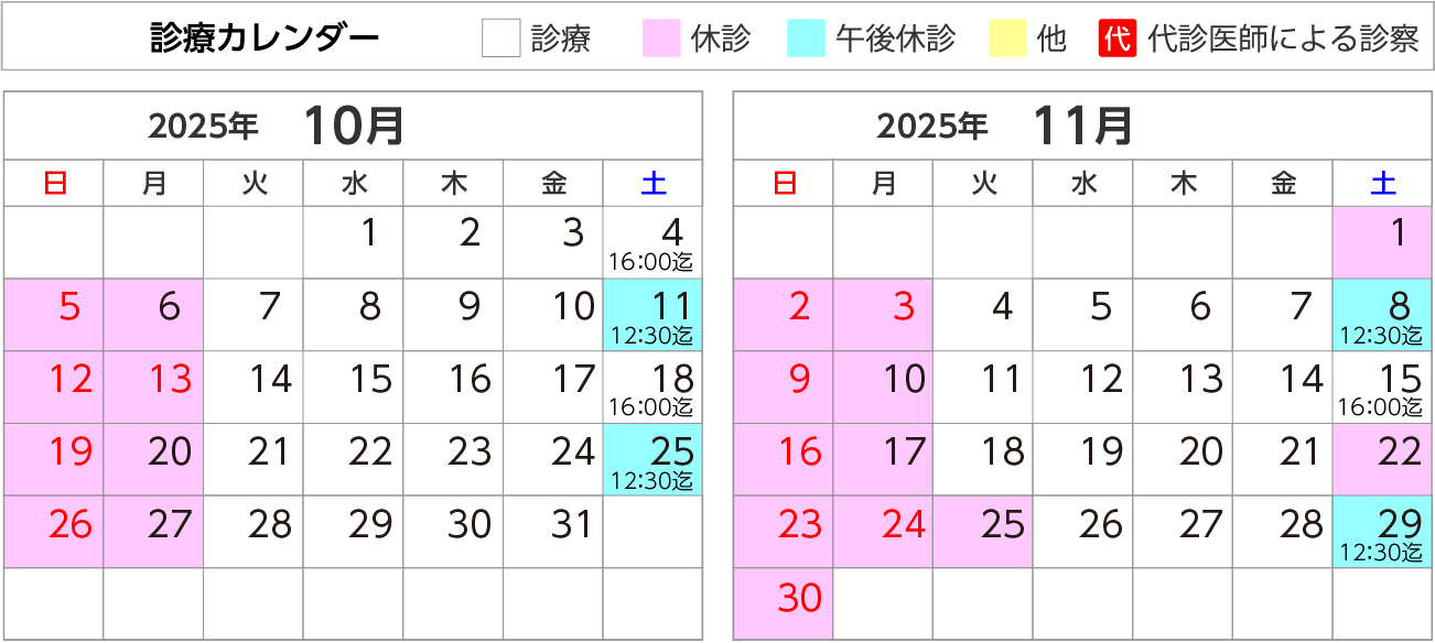 ※毎月1日に翌月の診療カレンダーを更新いたしますが、更新されない場合はご利用ブラウザのキャッシュの削除を行い、再度ページを読み込んでください。