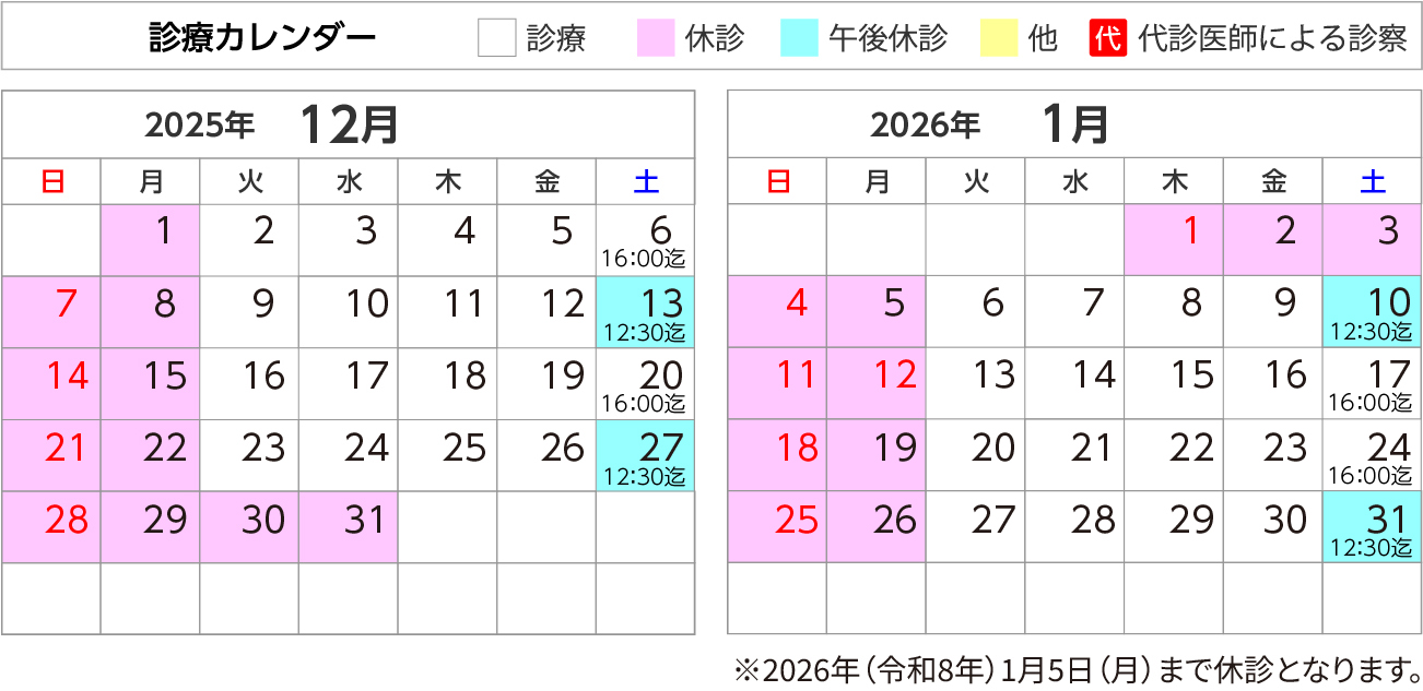 ※毎月1日に翌月の診療カレンダーを更新いたしますが、更新されない場合はご利用ブラウザのキャッシュの削除を行い、再度ページを読み込んでください。
